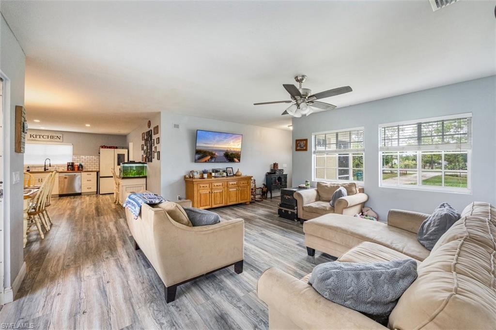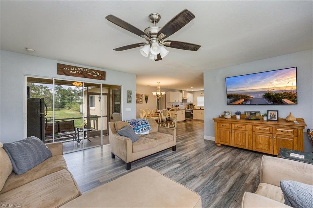 Charming Country Retreat on 1.4 Acres in Golden Gate EstatesrnrnWelcome to this peaceful and well-maintained three-bedroom, two-bathroom home nestled on 1.4 acres in the desirable Golden Gate Estates. Offering over 1,300 square feet of living space, this residence provides a serene escape with no HOA restrictions. Enjoy tranquil views from both the rear lanai and front porch. The kitchen features warm wood countertops, while the master bedroom is appointed with wood laminate flooring and a spacious walk-in closet. Additional features include manual hurricane protection and a fully fenced yard—ideal for pets, privacy, or gardening. Situated on a quiet road, this property is just a short drive from shopping centers, parks, and public golf courses. This is the perfect opportunity for first-time homebuyers or anyone seeking outdoor space and freedom from HOA fees. Schedule your private showing today—this home won’t disappoint!
